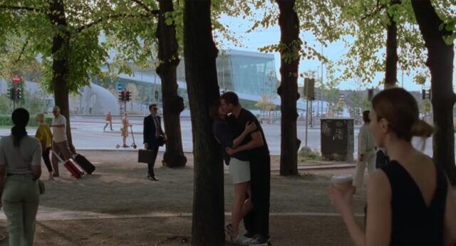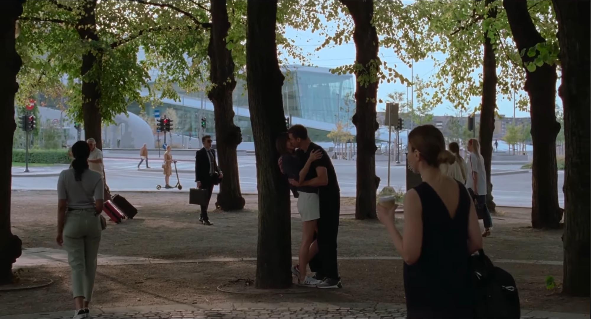 In The Worst Person in the World, the Oslo Opera House appears in the background during the scene where Julie and Eivind stand by a tree and kiss. Here the building is not used as a major set-piece, but as part of the emotional geography of Oslo itself. Its presence in the background helps anchor the moment in the city and adds to the film’s distinctly Oslo atmosphere, where recognisable urban spaces quietly become part of the characters’ intimate lives. The film is, of course, one of the key modern Oslo films, directed by Joachim Trier and released in 2021.