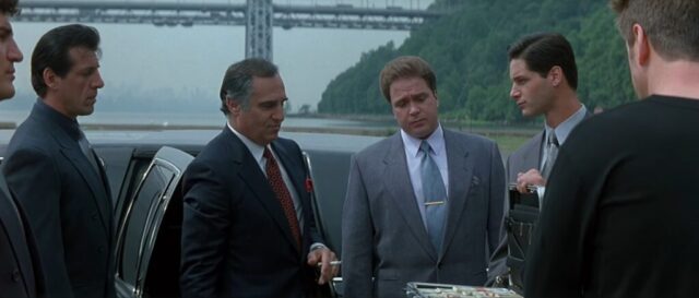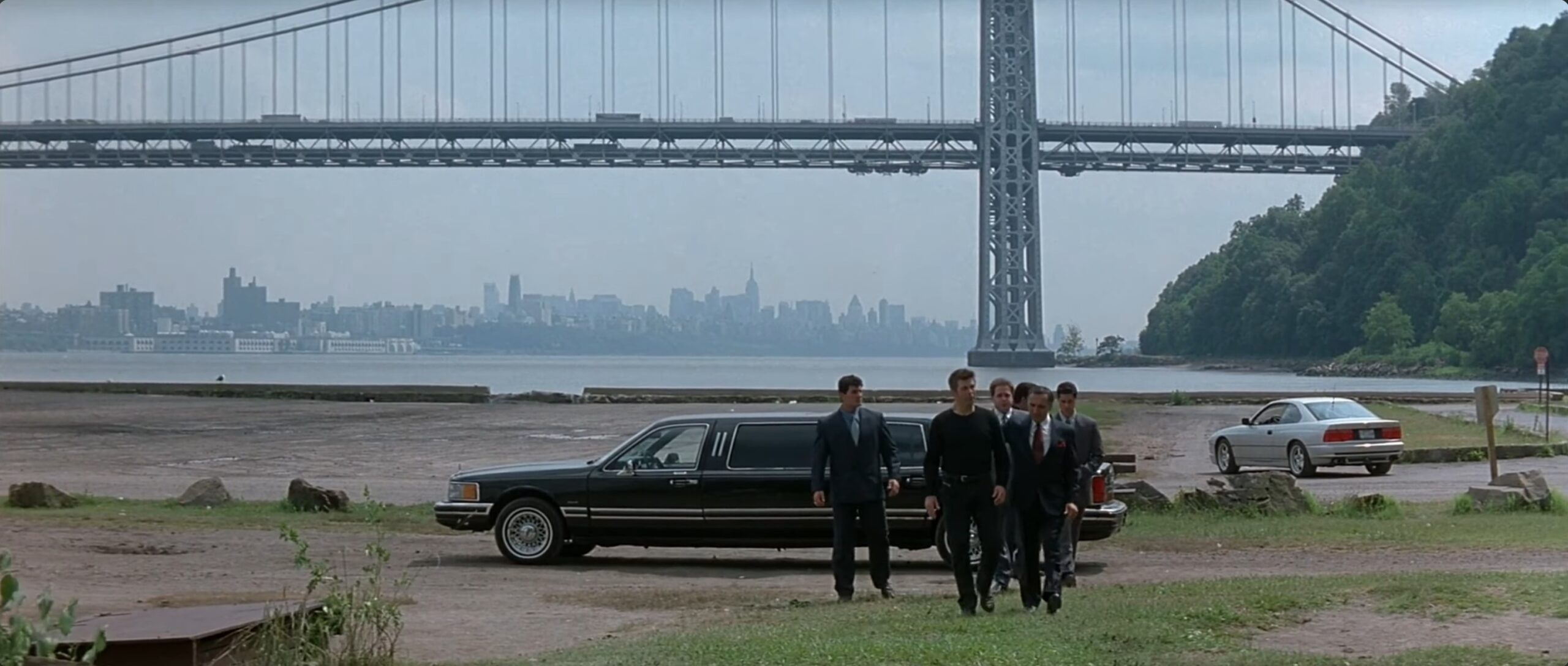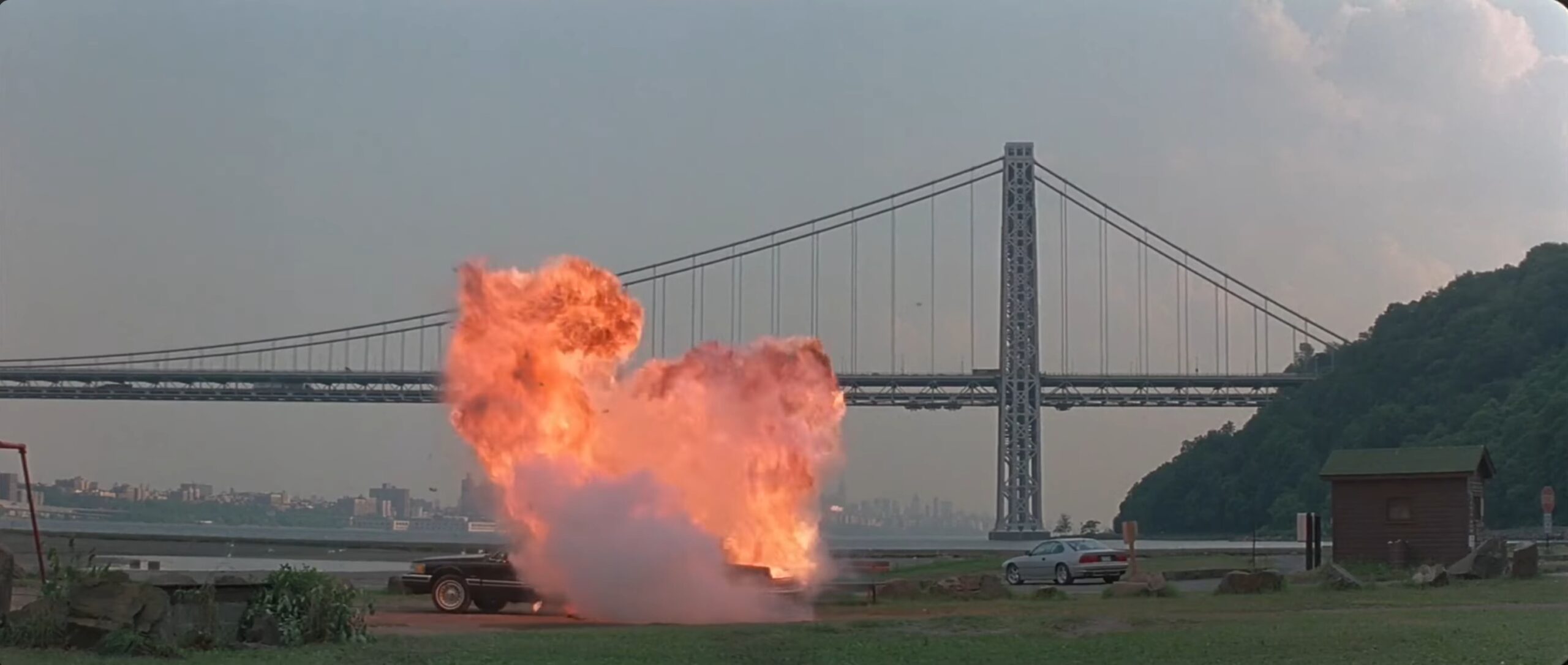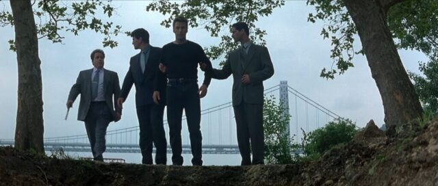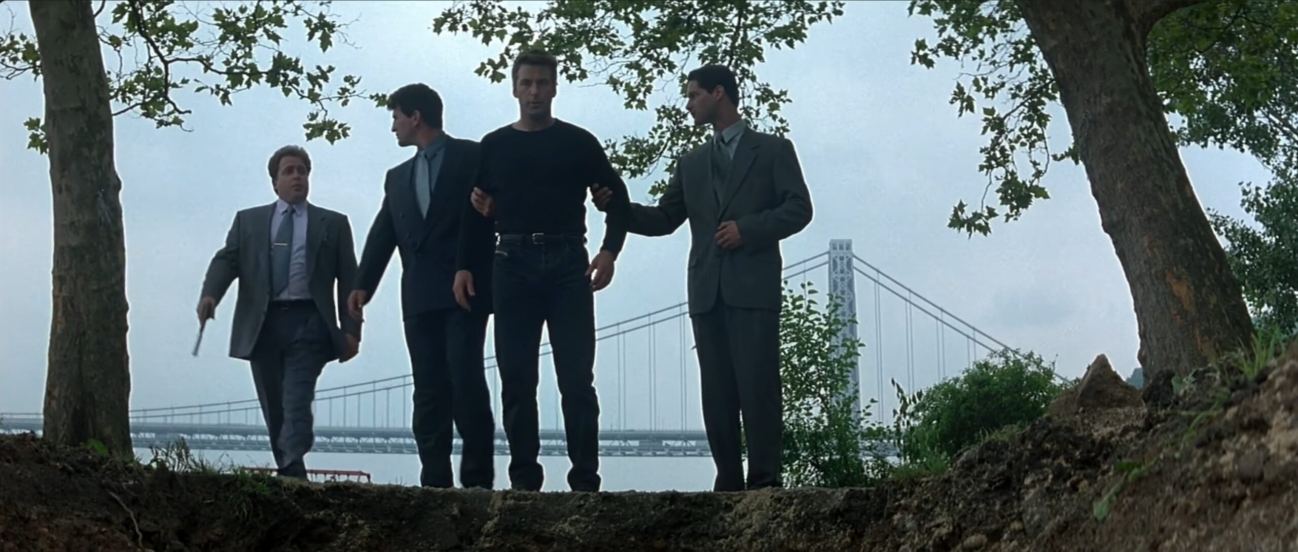 In The Juror (1996), Ross Dock Picnic Area / Palisades Interstate Park is used for the riverside confrontation between The Teacher, played by Alec Baldwin, and the gangsters who try to eliminate him after Annie Laird has turned his own plans against him. The scene takes place by the Hudson River, with the George Washington Bridge clearly visible in the background throughout the sequence. What begins as a planned execution turns into a violent shootout, as The Teacher anticipates the trap and kills the men sent after him. The open riverside setting, the cliffs of the Palisades and the massive bridge behind the action give the scene a bleak and exposed feeling, far removed from the courtroom and New York interiors that dominate much of the film.