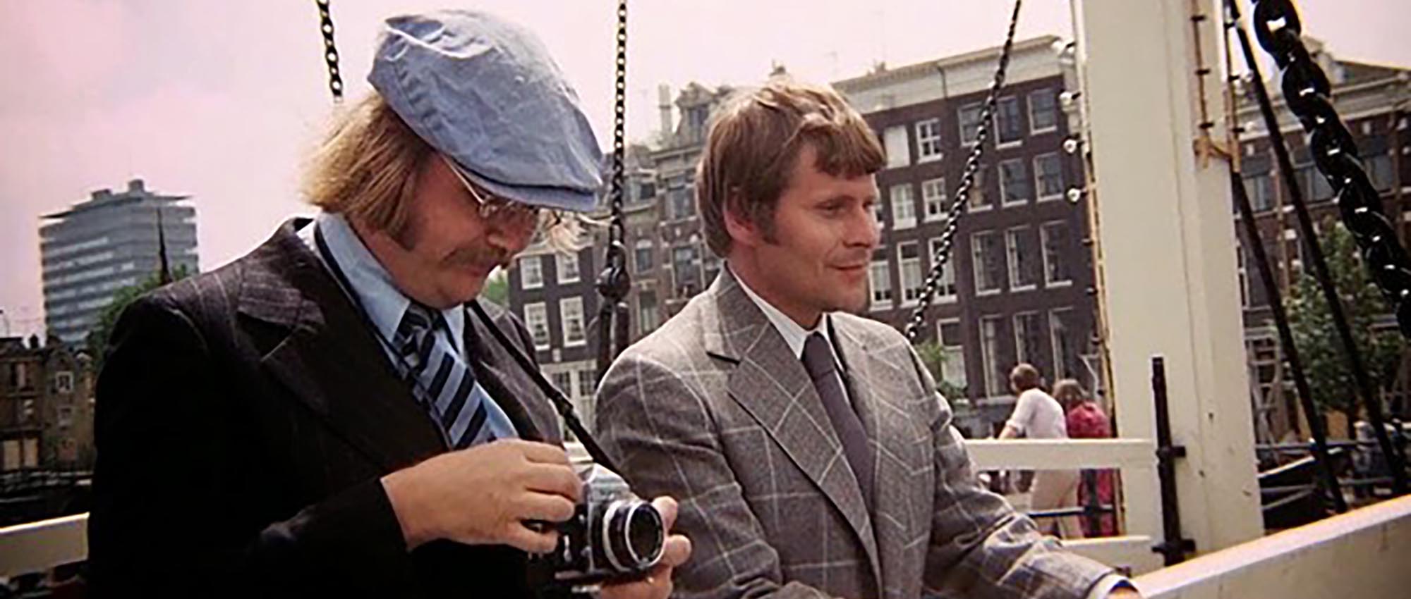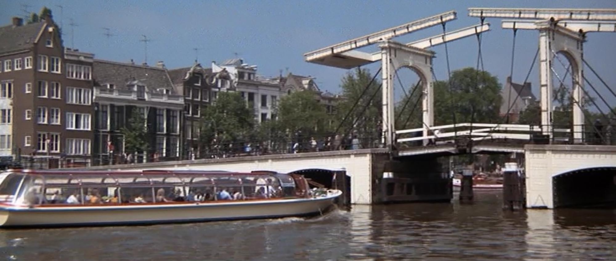 In Diamonds Are Forever (1971), the iconic Skinny Bridge serves as a key location where the body of Mrs. Whistler is removed from the Amstel River. Mr. Wint and Mr. Kidd are seen observing this scene while posing as tourists. The bridge spans the Amstel River, connecting Kerkstraat. The legend of the bridge’s being built is told by a boat tour guide.