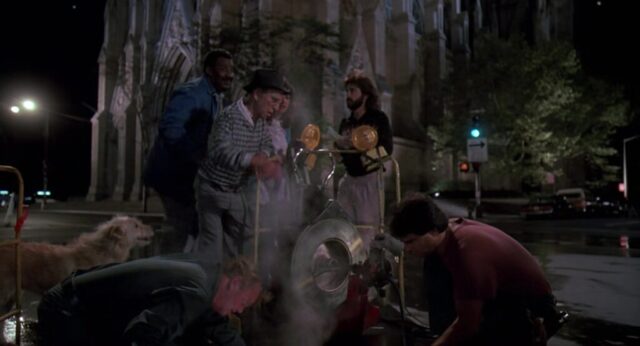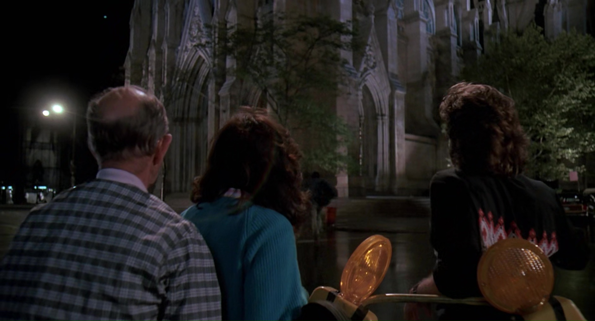 In Batteries Not Included, St. Patrick’s Cathedral appears in the background during the sequence that moves through Midtown Manhattan. The church can be seen near the corner of Fifth Avenue and West 50th Street, with the film using its side façade rather than the more familiar front entrance that most visitors recognise. This gives the scene a distinctly New York atmosphere, especially as it connects visually to nearby landmarks such as Radio City Music Hall and the route toward Times Square. Its appearance helps ground the film in a real and instantly identifiable part of Manhattan, while the cathedral’s towering Gothic architecture adds a dramatic backdrop to the characters’ nighttime journey.